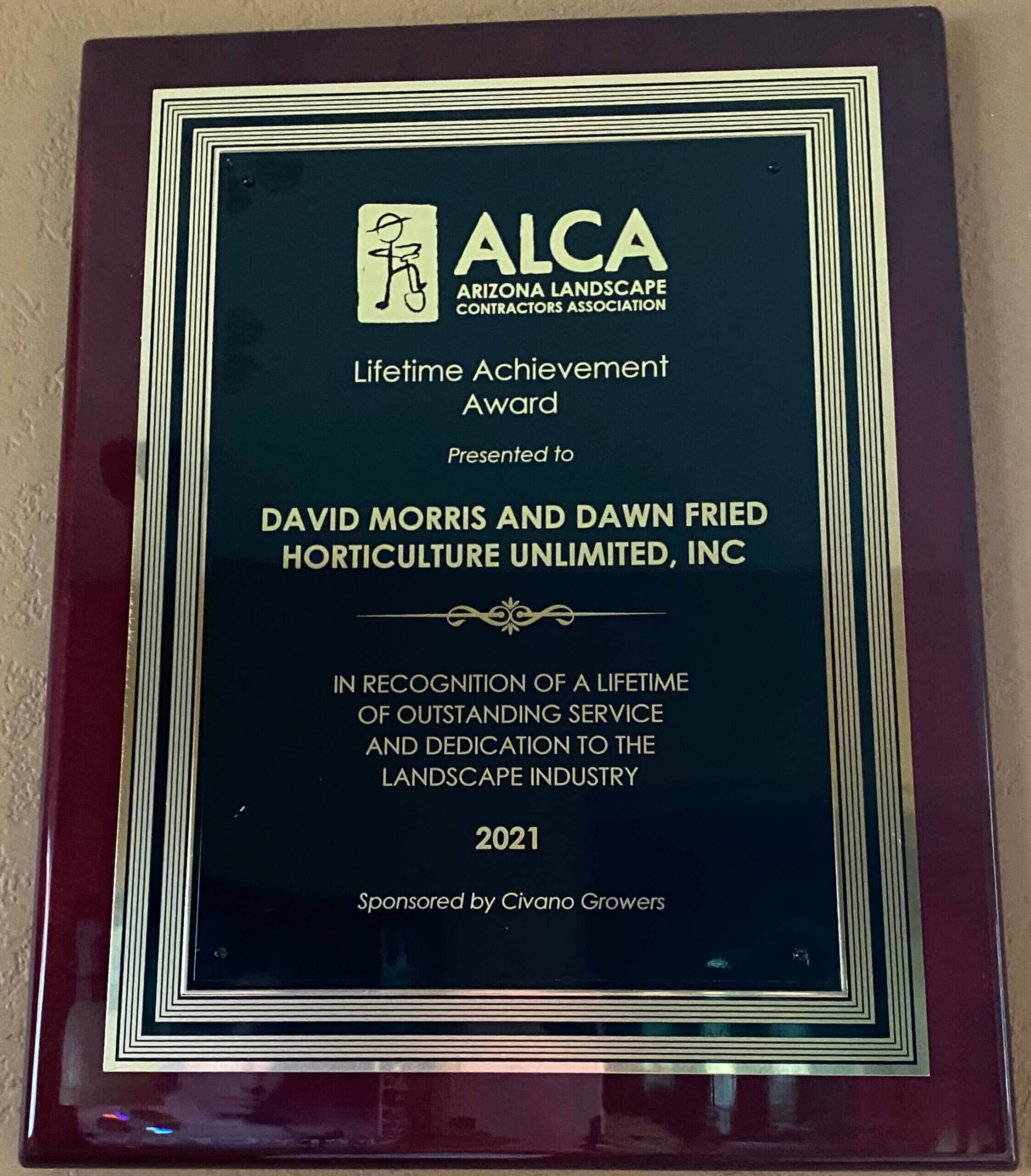 The Arizona Landscape Contractors Association (ALCA) gave its 2021 Lifetime Achievement Award to Horticulture Unlimited, Inc. owners David Morris and Dawn Fried.